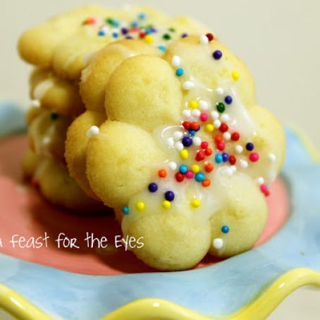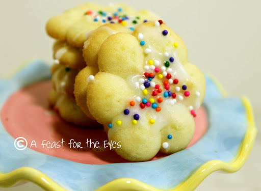 These cookies, with their touch of Fiori di Sicilia, are inspired by an Italian-American cookie made around Easter time. Although normally hand-formed, I was inspired to make these using my "Spritz Press". I decided to make a glaze (recipe from King Arthur Flour) that I drizzled over each cookie and then sprinkled with colored nonpareils. The Fiori di Sicilia is a baking extract that I buy from King Arthur Flour (online). It has notes of citrus and vanilla. You can, of course, use your own favorite extract-- almond, lemon, whatever you like. If you don't own a cookie press, you can use a pasty bag with a large tip to press out your cookies in whatever shapes you like. The traditional shape is more of a round/wreath. Cookie recipe adapted from Fine Cooking. Please click on the recipe source to see how I made these on my food blog, "A Feast for the Eyes".