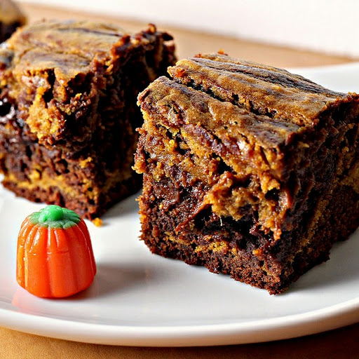 Preheat oven to 350 degrees. Butter a 9-inch square baking pan or dish. Cut a length of parchment or aluminum foil that will cover the bottom and two sides of the pan with a little overhang ad line the pan with it. Butter the lining as well. Melt chocolate and butter in a heatproof bowl set over a pan of simmering water, stirring occasionally until smooth. Whisk together flour, baking powder, cayenne pepper, and salt in a large bowl. Set aside. Put sugar, eggs and vanilla in the bowl of an electric mixer fitted with the paddle attachment. Beat until fluffy and well-combined, 3-5 minutes. Beat in flour mixture. Pour half of batter (about 2 cups) into a separate bowl and stir chocolate into it. If you find that it is a little thick, then add more batter (until it is pourable) as it will be easier to swirl if this is thinner. In the bowl with the remaining batter, stir in the pumpkin, oil, cinnamon, and nutmeg. Transfer half of the chocolate batter to the prepared pan, smoothing the top with a rubber spatula. Top with half of pumpkin batter. Repeat to make one more chocolate and one more pumpkin layer. With a small spatula or table knife, gently swirl the two batters to create a marbled effect. Bake until set, 40 to 45 minutes. Let cool in pan on a wire rack. Cut into 16 squares.