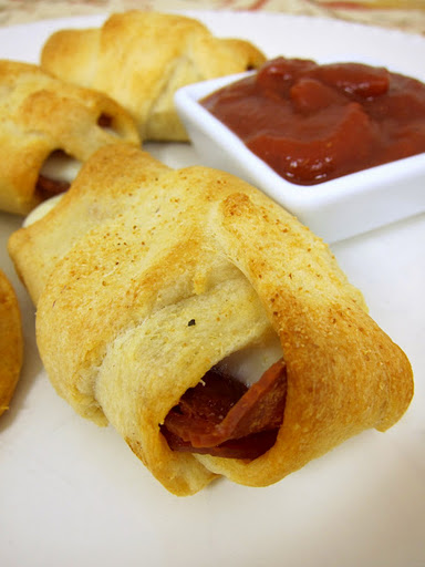 Unroll crescent rolls and separate into 8 triangles. Place 5 slices of turkey pepperoni on each crescent roll. Top pepperoni with string cheese half and roll up. Sprinkle crescent rolls with garlic powder. Place rolls on baking sheet and bake for 12-15 minutes, or until golden brown. Serve with a side of warm pizza sauce.
