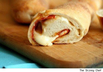 Preheat the oven to 400 degrees F. Coat a large baking sheet with nonstick spray. Cut the dough in half. Roll each piece out into a 2-inch by 12-inch log. Divide the pepperoni between the two pieces. Sprinkle with mozzarella and Parmesan. Starting with the longer side, roll the dough up and press the edge to seal in the ingredients. Transfer to the cookie sheet, seam side down. Tuck the ends under and drizzle with olive oil. Bake 10 to 15 minutes until the bread is cooked through and lightly brown on the top. Cool 5 to 10 minutes before slicing.