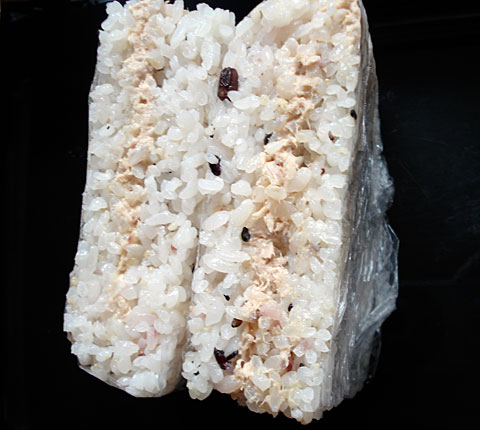Finally, here is a sort of tuna salad ‘sandwich’ (which is actually a variation of oshizushi or pressed sushi), using sushi rice instead of bread. This makes two or four ‘sandwiches’.