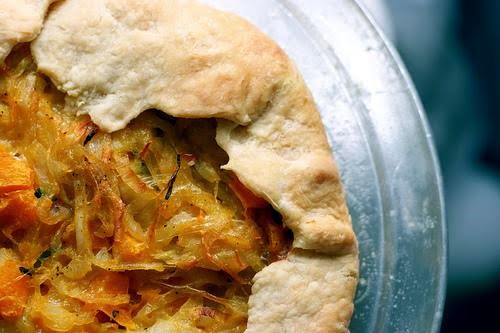 5. Assemble galette: On a floured work surface, roll the dough out into a 12-inch round. Transfer to an ungreased baking sheet. Spread squash, onions, cheese and herb mixture over the dough, leaving a 1 1/2-inch border. Fold the border over the squash, onion and cheese mixture, pleating the edge to make it fit. The center will be open.