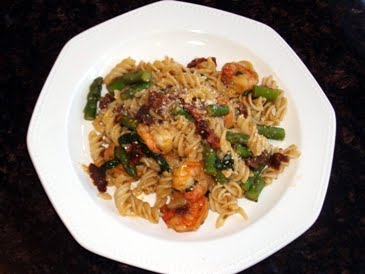 5. Add pasta, asparagus and shrimp to sauce. Season with salt and pepper. Stir in the basil. Transfer to four serving plates and top each serving with fresh Parmesan.