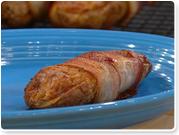 Halve potatoes lengthwise. Scoop out the flesh, season with salt and pepper, and mash with sour cream, remaining butter, cheese and caramelized onions. Fill potato skins with mashed potatoes and wrap each potato entirely in bacon, overlapping slices a little as you wrap them. Arrange on baking rack set over a baking sheet and roast until bacon is crispy, 15-20 minutes.