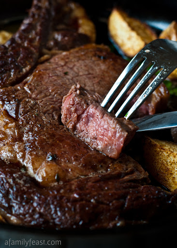 Turn off the heat and baste one more time. Leave the steak in the pan loosely covered with foil for 10 minutes and allow to rest before cutting. Baste one more time, and remove to a cutting board. Either cut the steak in half for each serving or for a nicer presentation, slice on the bias and serve slices.