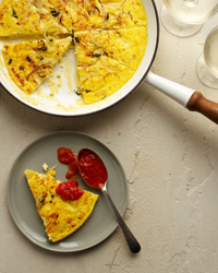 Turn the frittata out onto a serving platter and let cool. Drizzle the frittata with olive oil and serve at room temperature, with the tomato sauce on the side.