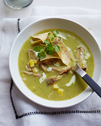 In a mini food processor, puree the sour cream with the remaining 2 tablespoons of cilantro. Ladle the soup into shallow bowls and garnish with the cilantro crema, cilantro leaves and tortilla chips.