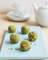 Scoop up scant tablespoons of the date mixture and roll into balls. Roll the balls in the pistachio powder to coat them completely and serve.