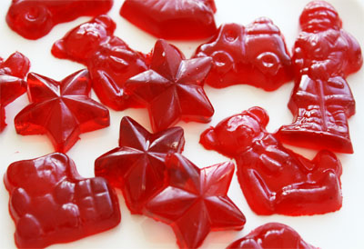 - 1 -3 oz box of flavored gelatin and 2 - 1/4 oz packages of unflavored gelatin, water and candy molds. (we used two candy molds)