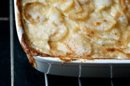 Bake about 1 1/2 hours in the preheated oven, or until potatoes are tender and top is golden.