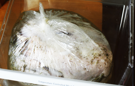 Remove giblets and neck from the cavity. Rinse the outside and inside of a thawed turkey. Using paper towels, pat the turkey dry. Complete submerge the turkey in a large soup pot bigger than the bird and cover with a lid. Allow the turkey to marinate for 12 hours for a small turkey (8-10 lbs) and up to a full day for a bigger bird. Rinse turkey and pat dry before adding additional seasoning, butter, or oil in preparation for roasting.