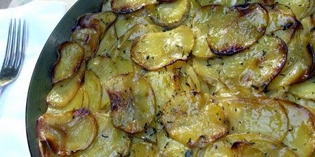 1. Heat the oven to 400°F/200°C. Line an 8-inch/20 cm baking tin with parchment, and brush with butter. Peel and thinly slice the potatoes, then toss in a bowl with the cream to saturate. Pulling the potatoes from the cream, build layers of them in the baking tin, seasoning and scattering over herbs as you go. Brush another sheet of parchment with butter and place it butter-side down on the potatoes. Set another heavy dish on top to weight down the potatoes. Bake until tender, 1 to 1-1/2 hours. Let cool before turning out and cutting into squares or wedges to serve.