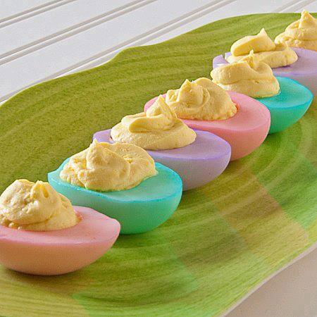 9. Pipe or spoon the yolk mix into the colored egg whites.