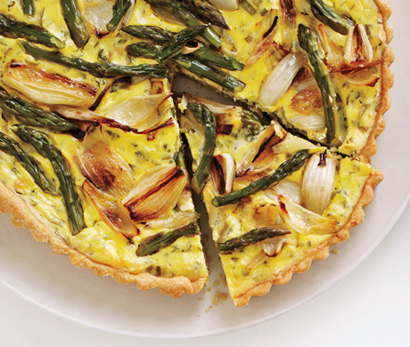 Meanwhile, heat remaining 1 tablespoon oil and butter in a medium skillet over medium heat. Add sliced asparagus and pale-green parts of spring onions; season with salt and pepper. Cook, stirring often, until onions are soft and asparagus is bright green and tender, 6-8 minutes. Let cool slightly in pan. Spread evenly over bottom of tart crust.