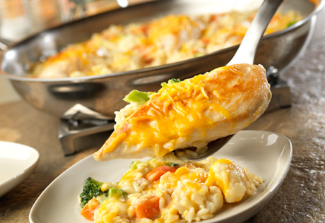 Chicken breasts, Campbell's soup, frozen veggies, and rice come together to create this one-pan dinner perfect for using what's already in your pantry and freezer.