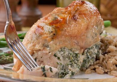 Place stuffed chicken breasts in a greased baking dish(es) and bake 35 to 45 minutes or until chicken is done and skin is golden brown. Serve immediately.