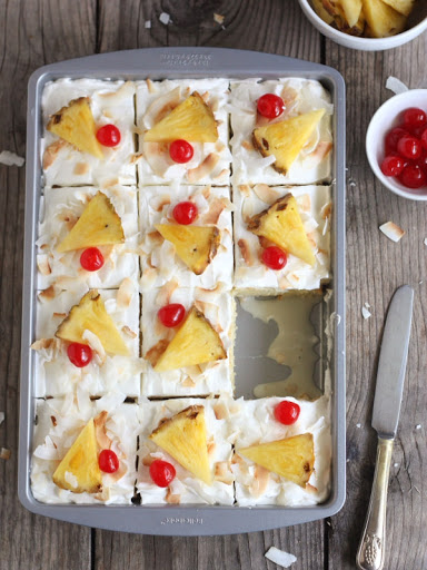 Pour the batter into the prepared sheet pan. Sprinkle the remaining pineapple on top of the batter. Bake until cake is golden brown and the center bounces back when touched gently, about 30 minutes.