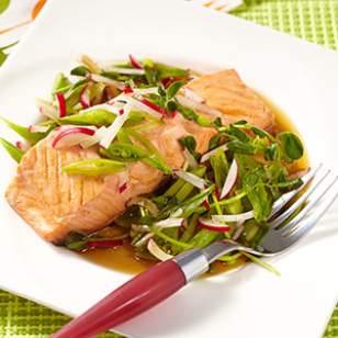 Meanwhile, combine radishes, snap peas and pea sprouts in a medium bowl. When the fish is done, pour the braising liquid into the bowl and toss to coat. Serve the salad on the fish.
