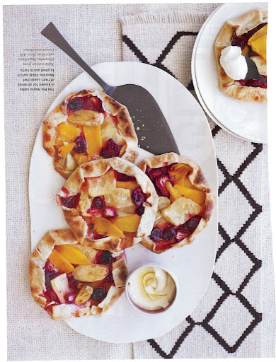 3. Arrange the pineapple, mango and banana slices on the pastry rounds and scatter the strawberries and blueberries on top. Bring the pastry edges up and around the fruit, pinching firmly to form a pleated rim on each tart. Refrigerate the tarts until firm, 10 minutes.