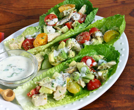 Chicken and Avocado lettuce boats with buttermilk Dijon dressing