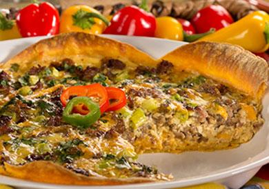 Place corn tortillas in prepared pie plate, overlapping and extending up sides. Evenly layer cheeses and sausage over tortillas.