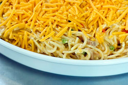 When spaghetti is cooked, combine with remaining ingredients except additional 1/2 cup sharp cheddar.