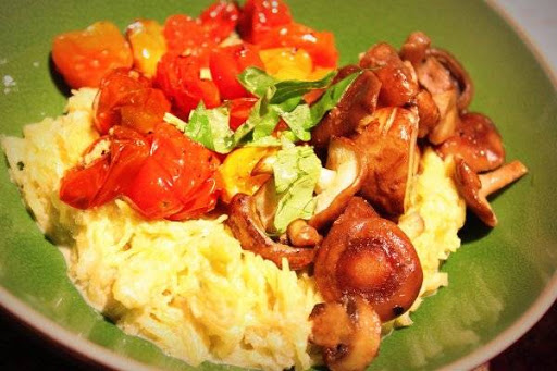 Take tomatoes, mushrooms and squash out of the oven. Turn squash cut side up, sprinkle with a dash of sea salt and olive oil and put back in the oven for 5 minutes.