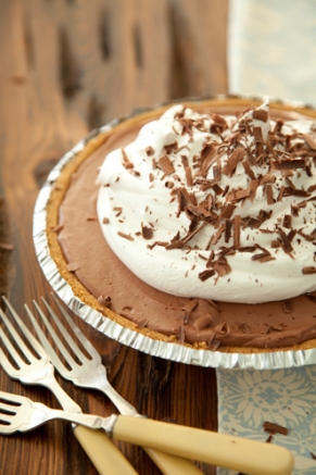 For the topping, just before serving, beat 1 cup cream on medium speed of an electric mixer until it begins to thicken. Add confectioners’ sugar and whip until stiff peaks form (tips stand straight). Spread the whipped cream over the top of the pie. Using a grater or vegetable peeler, make pieces or shavings of milk chocolate, white chocolate, and semisweet or dark chocolate. Garnish pie with chocolate pieces. Serve immediately.