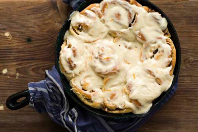 Bake the rolls uncovered until the tops are golden brown, about 15 minutes. While the rolls are baking, make the frosting by creaming together the cream cheese, butter, and powdered sugar until smooth. Stir in the juice, zest, vanilla and salt. Spread the frosting onto the rolls while they are still warm.