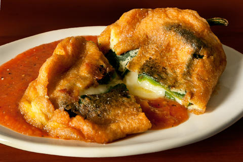 Season the inside and outside of the chiles with salt and pepper. Stuff each chile, being careful not to tear them, with a quarter of the cheese (about a heaping 2/3 cup) and close the flaps over the cheese; set the chiles aside.
