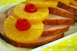 OPTIONAL: take toothpicks and put pineapple rings around ham (looks pretty to serve)...can also place maraschino cherries or mandarin oranges in center of rings.
