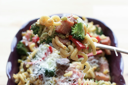 Add the ham to the hot skillet and allow it to brown for a minute or so before stirring. When the ham pieces are hot and lightly browned, add the cream to the skillet. Let it simmer and slightly thicken for 1-2 minutes, until it coats the ham pieces. Add the vegetables, toss to coat and then stir in the pasta. Let the sauce cook for another 2-3 minutes as needed, to thoroughly coat the pasta. (If the pasta is too dry, add a small splash of milk until it reaches the desired consistency.)
