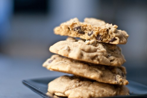 Scoop roughly 1/4 cup of batter for each cookie onto a baking sheet (it’s okay if the balls are jagged) leaving enough room for them to spread. Bake 1 sheet at a time for about 12-15 minutes each or until the edges are set, but the middle is still soft. You may need to experiment with your oven to figure out the perfect cooking time. As these cookies bake, they go from chewy to cakey to crisp, so you can change their characteristic by the amount of time you bake them for.