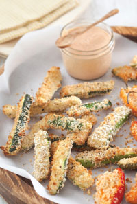In a shallow bowl, place seasoned bread crumbs. In a separate shallow bowl, place egg whites. In another shallow bowl, place panko, salt, and pepper. Dip each zucchini piece in seasoned bread crumbs; dip in egg white to coat, letting excess drip off. Dredge in panko mixture. Place on prepared rack.