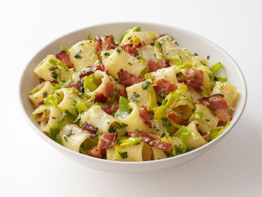 Add the pasta to the skillet along with the parmesan, half of the bacon and 1/2 teaspoon pepper; toss to coat, adding enough of the reserved pasta cooking water to loosen. To serve, top with the remaining bacon, more parmesan and parsley.