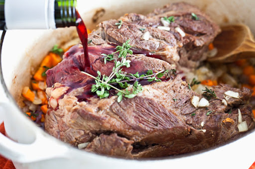 Place it on top of the vegetables and pour the merlot mixture over the top. Pour beef broth over the top until it covers the top of the meat.