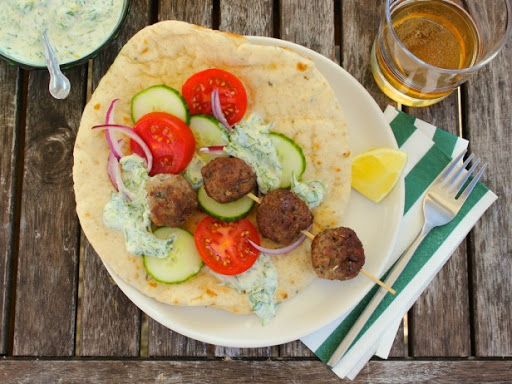 To serve, top each flatbread with sliced tomatoes, red onion, cucumbers and meatballs. Top each with tzatziki. Serve with lemon wedges.