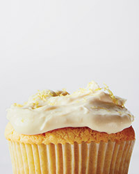 Spoon the batter into the muffin cups and bake for about 25 minutes, until the cupcakes are lightly golden and a toothpick inserted in the center comes out clean. Transfer the cupcakes to a wire rack and let cool completely. Frost the cupcakes and garnish with lemon zest.