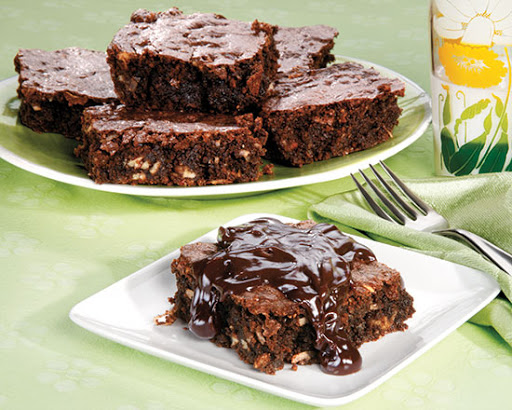 Servings 15; Serving Size 1 brownie with sauce (100g); Calories 340; Calories from fat 140; Total fat 15g; Cholesterol 75mg; Sodium 130mg; Carbohydrate 51g; Dietary Fiber 3g; Sugars 40g; Protein 4g.