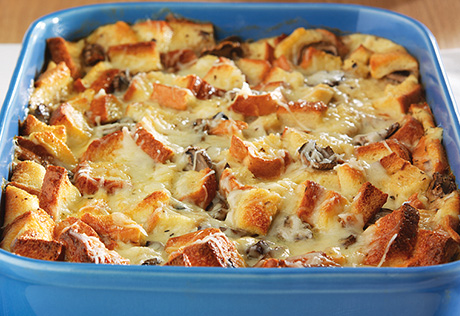 3 Beat the soup, eggs, milk, thyme and black pepper in a medium bowl with a fork or whisk. Pour the soup mixture over the bread and mushrooms, pressing down the bread to coat. Let stand for 30 minutes.