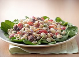 Just before serving, place 2 cups of the spinach on each of 4 plates; divide pasta salad evenly over spinach.