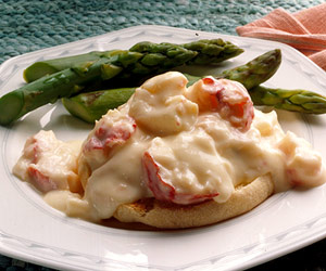 Stir in lobster, dry sherry, ground red pepper, and white or black pepper. Heat through. Serve over English muffin halves.