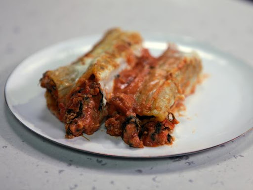 Working over the casserole dish, fill the manicotti with the meat using a spoon. Top the manicotti with the white sauce and Parmesan. Cover with parchment and foil and cool or bake off. Bake, covered, at 375 degrees F for 40 minutes from fresh, or bake 1 hour from cold to heat through and cook the pasta. Then uncover and bake until brown and bubbly, about 20 minutes more.