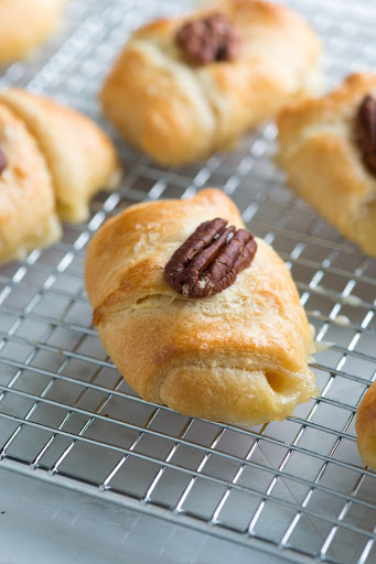 These mini brie roll-ups make for a great snack or party appetizer! You just need some dinner rolls, brie, an egg, some pecans, and you're set!