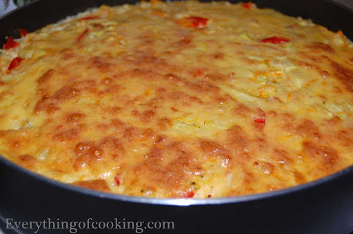 Now place the vegetables into a deep pre-oiled roasting pan and pour the egg-cheese mixture over the top. Bake in the pre-heated oven at 350ºF (180ºC) until the top gets brown, it usually takes 30 to 50 minutes.