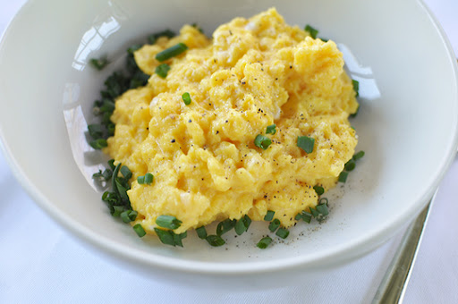 • Some people use milk in their scrambled eggs. I firmly believe that this makes the eggs rubbery. The full-fat whipping cream makes them creamy, but use it or leave it out completely. Don't substitute milk.
