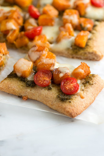 2. Evenly spread the pesto over the baked pizza crust then scatter the butternut squash, mozzarella cheese and cherry tomato halves on top.
