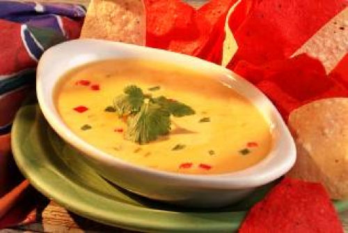 Once the Velveeta is melted and the ingredients blended, the chile con queso is ready. Serve in bowls as a hot dip with tortilla chips. You can also use it to make nachos.