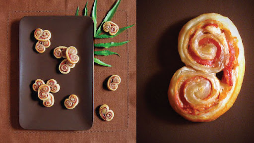 Slightly salty with a bite of mustard, these savory palmiers feel very Mediterranean in flavor. The name comes from the palm like shape that is easy to achieve by rolling the dough from each end towards the center.