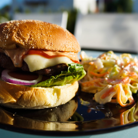 4. Remove the meat from the fridge and shape the mixture into 4 - 1/2lb patties. Brush burgers with olive oil (be careful because they will flame up) and grill about 4 minutes per side (time will very upon preference). Top each burger with a slice of cheddar cheese and two bacon strips.